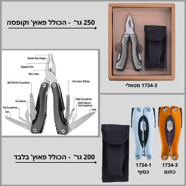 סכין, מסור, שופין, פותחן, פלייר, קאטר, מברגים ועוד..