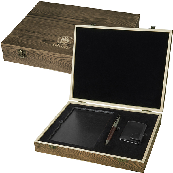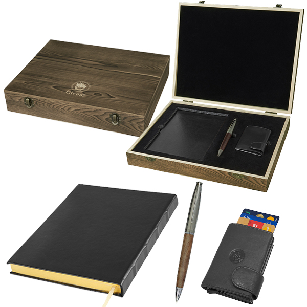ערכת מתנה מהודרת הכוללת עט X-PEN / מחברת עסקים וארנק בטיחות במארז עץ מבית המותג גבעוני
